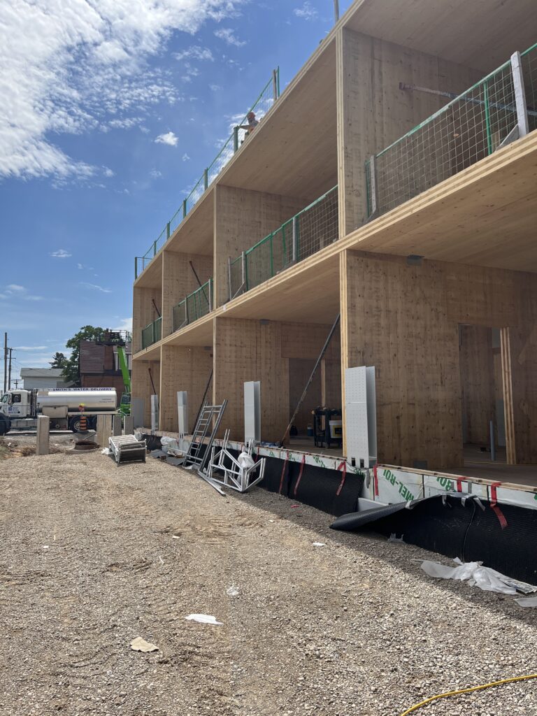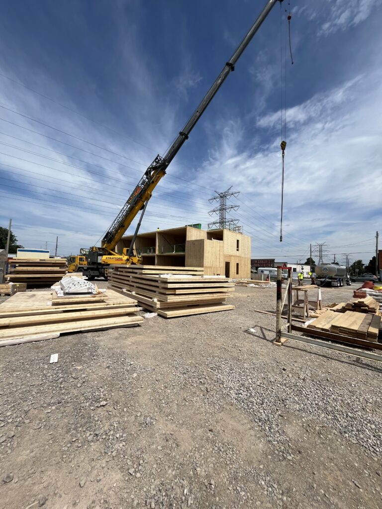 1620 Main St E is located adjacent to the 55 Queenston Rd site and is CityHousing Hamilton’s first mass timber project. Mass timber uses sustainably harvested wood in cross laminated timber panels for almost the entirety of the structure, including the stairwells and elevator shafts.