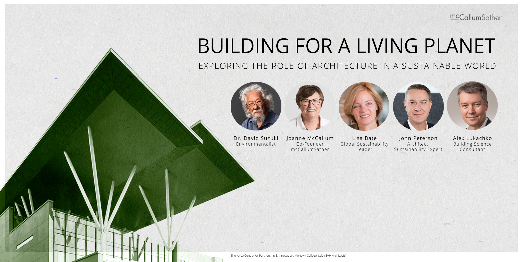 The panel discussion will further explore pressing topics such as the role of design in creating resilient and regenerative communities. The panelists will feature Dr. David Suzuki, mcCallumSather’s Joanne McCallum, and senior architect and sustainability expert, John Peterson and global sustainability leader and Net Zero carbon strategist, Lisa Bate. The discussion will be moderated by Alex Lukachko, Building Science consultant and educator at the University of Toronto and the Climate Design Initiative.