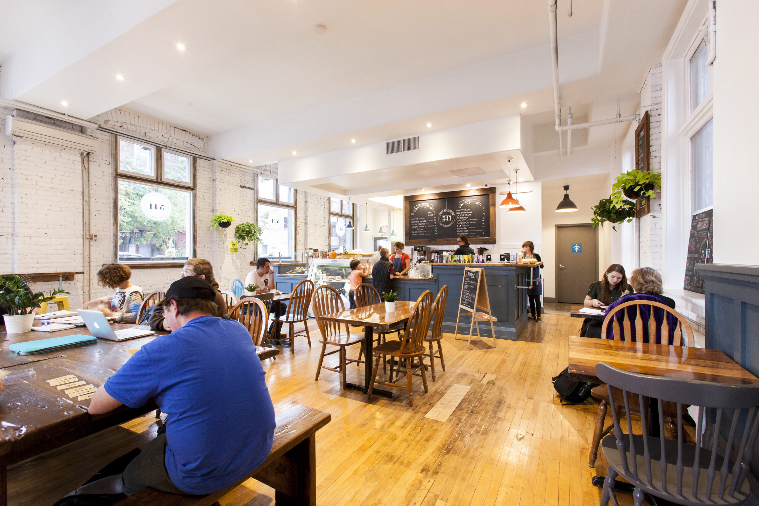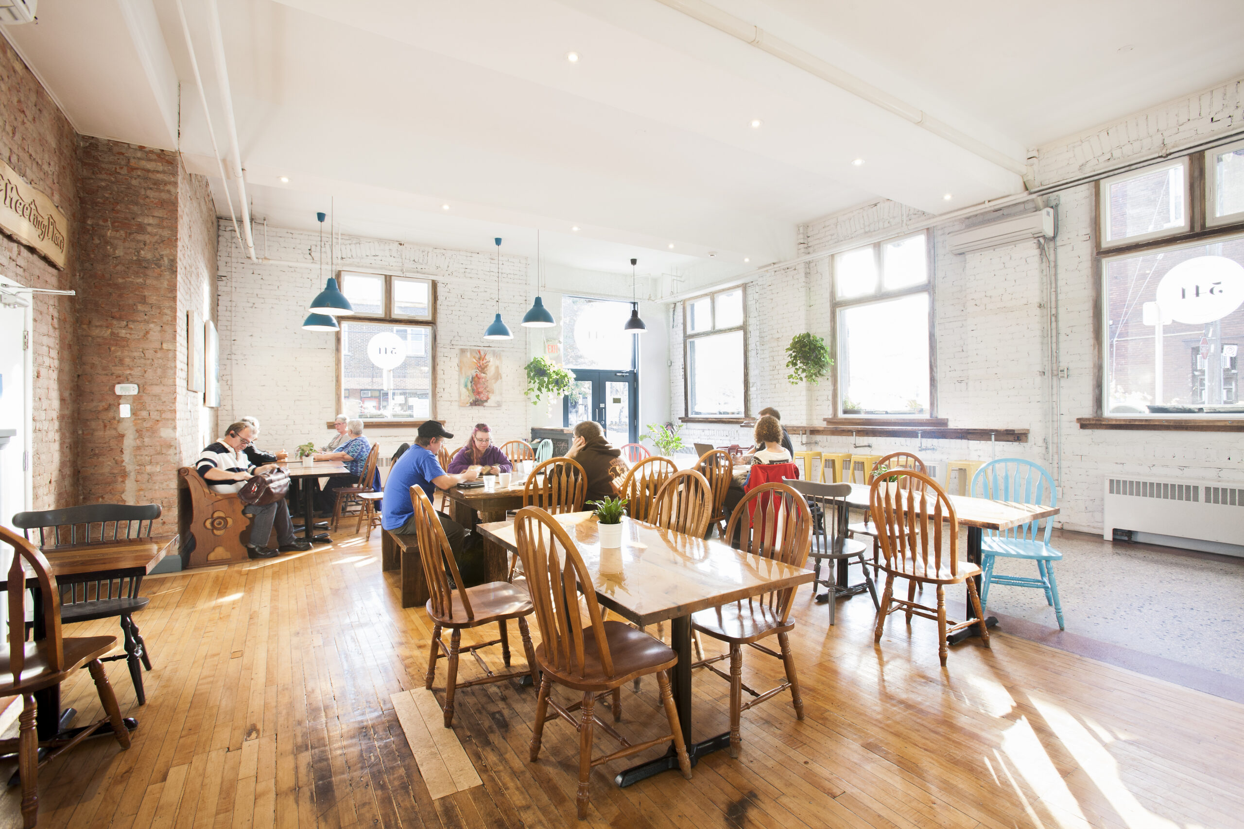 The award-winning project transformed a former uninviting apartment building into a supportive and inclusive community hub. Apartments were maintained on the upper level, while the lower level became both a café and social enterprise, called 541 Eatery & Exchange. With high quality food offerings, and a slightly lower price point, paying customers were invited to purchase buttons which could be redeemed by fellow diners in need, and the programming of the space allowed for educational, youth employment and training workshops. The barrier-free design of the space promotes inclusivity and universal accessibility. The massing and details of the 100-year-old building were preserved, anchoring, and activating the corner of Barton Street and Sanford Avenue.