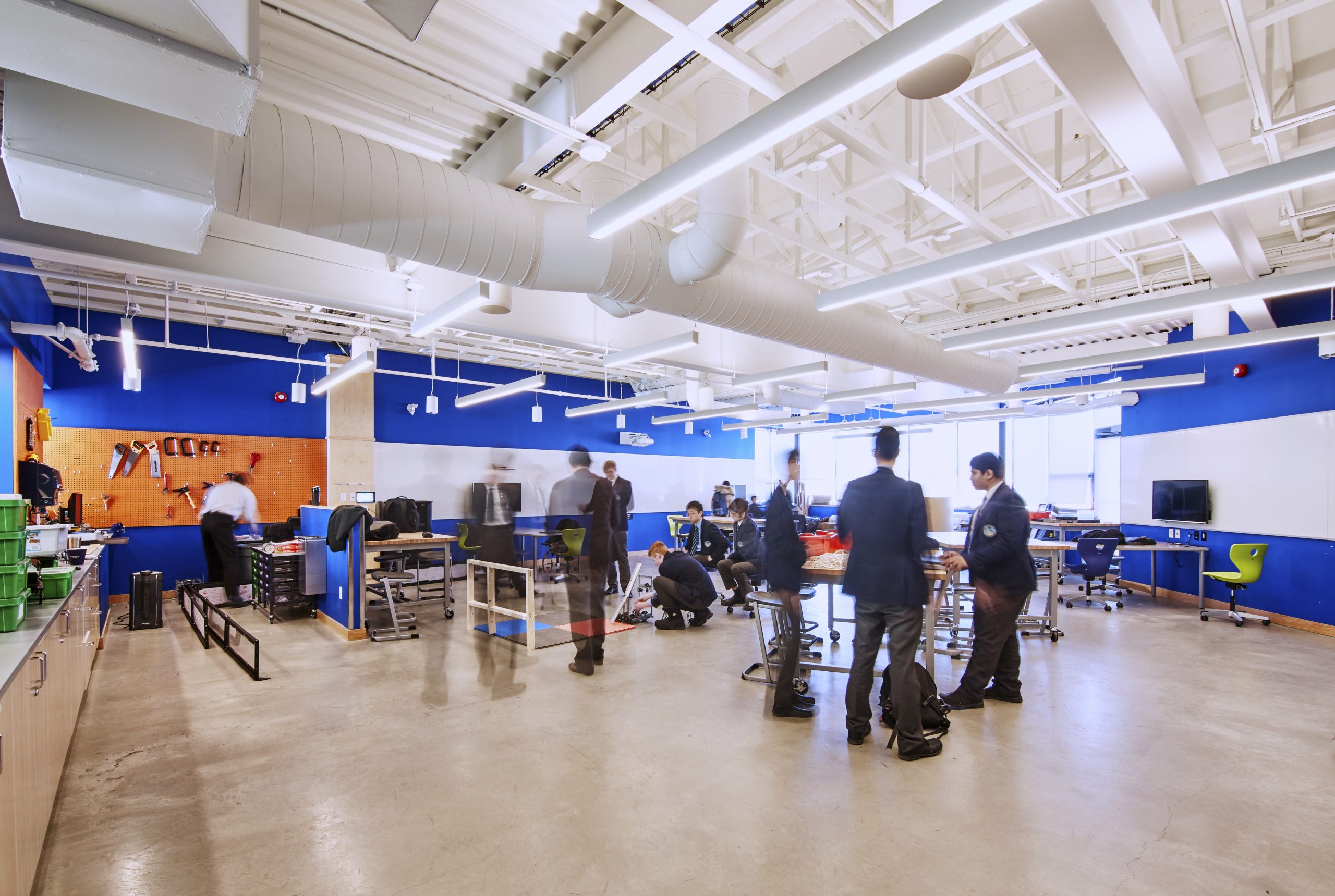 The first-floor renovations of the Barr Commons addition improved entry and locker areas while creating student resource offices and study spaces. The second-floor design lab, built on the former roof, features an open ceiling with exposed mechanical systems serving as efficient HVAC solutions and educational tools. This versatile, hands-on space includes TVs, laptop plugins, erasable walls, mobile desks and chairs, a pegboard wall, and ample storage, fostering a dynamic learning environment. Preserved original windows ensure natural light and transparency, while custom acoustic solutions balance noise levels for a comfortable student experience.