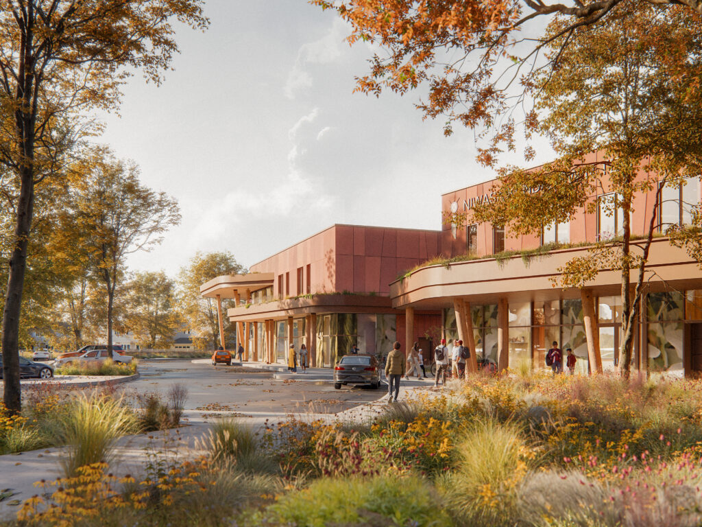 The landscape is equally integral, with rain gardens, pollinator beds, and medicine gardens creating habitat and reinforcing relationships between people and the natural world. Mature trees have been preserved, and naturalized play areas are positioned alongside the McQuesten Urban Farm, fostering intergenerational connections to food and land.