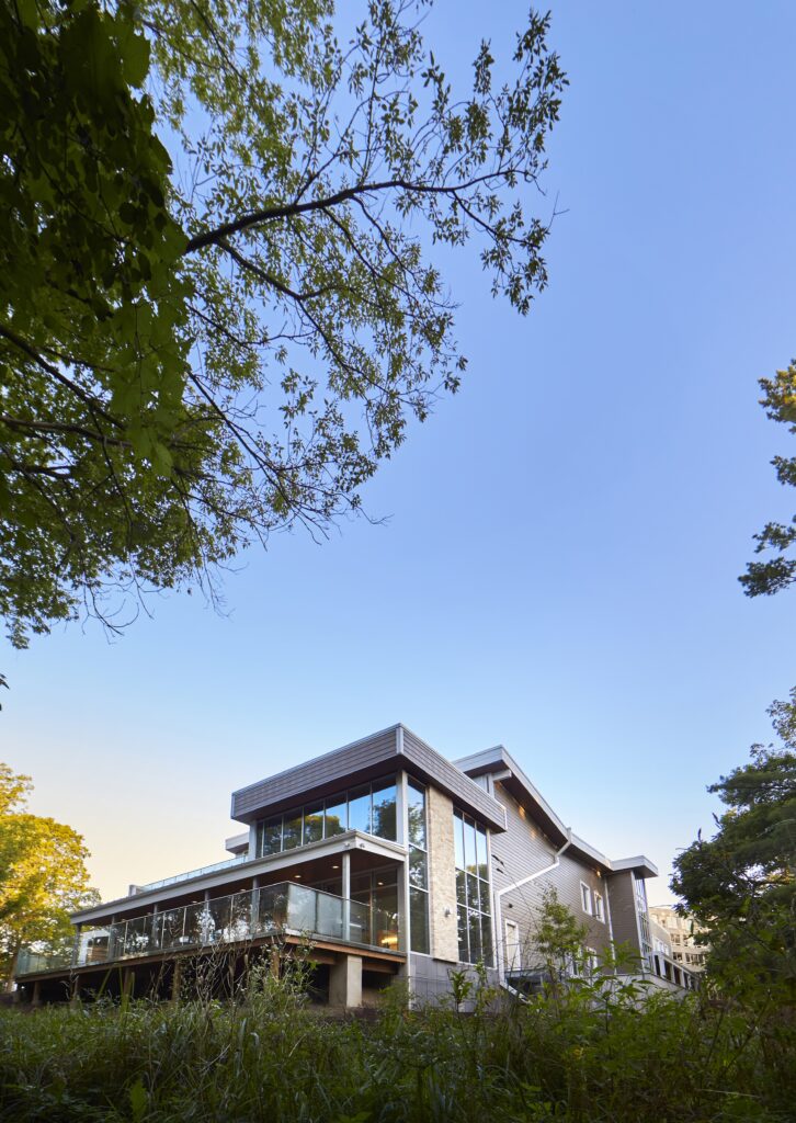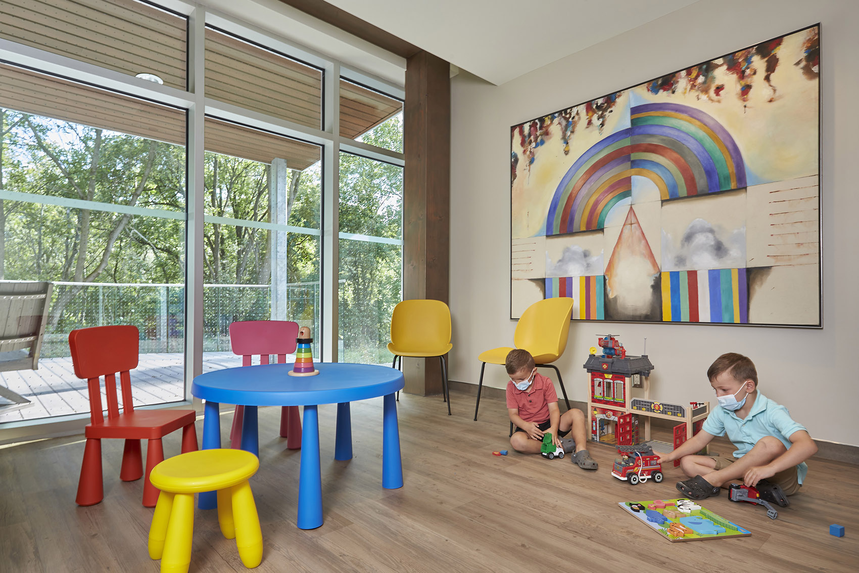 The design, organized into two wings, is informed by its connection with the site’s beautiful natural surroundings, paying attention to every detail that would support meaning, comfort and peace for residents, their families and caregivers. The rooms, organized to look over the ravine and feature an innovative detail – a private, covered deck, with patio doors designed larger than standard, allowing patient beds to be wheeled outside. Lining the opposite side of each corridor are nursing stations, therapy rooms, and quiet spaces for families, the essential functions of the healthcare space, but where the views are not of primary importance. The wood-framed structure uses rustic Douglas-fir columns, natural cedar, hand-cut and carved stone. At the end of each corridor are smaller, more intimate family living rooms, one with a library and large window seat. At the heart of the facility is a great room, with double height ceilings and stunning views, providing the backdrop for a kitchen and dining, living room, children’s area and expansive deck.