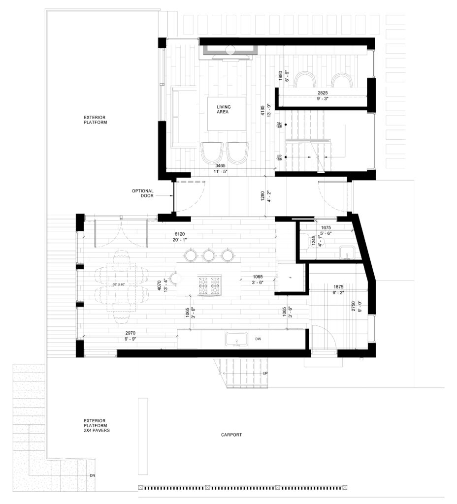 On one side of the minimalist design, a pitched roof with cedar cladding is reminiscent of a traditional east coast aesthetic, while the other side features a flat roof and metal cladding, modern touches. The two styles converge into a 1,700 sq. ft. home where guests are immediately welcomed into the minimalist interior with unobstructed views of the striking blue waters of Lake Huron. On the main level is an office area, living room, mudroom and large kitchen, surrounded by a wraparound patio. The lower level is a workshop, with doors that open directly into the garden.