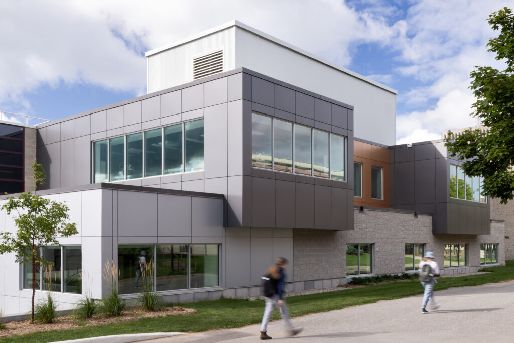 The contemporary two-storey addition to the existing Inniskillin Hall brings a wide range of equipment and laboratory space under one roof and combines it with areas for training and mobilization as well as hosting for community events. The light-filled labs are a welcoming space to work, connecting visually with a main pathway through the campus and creating a showcase of its science.